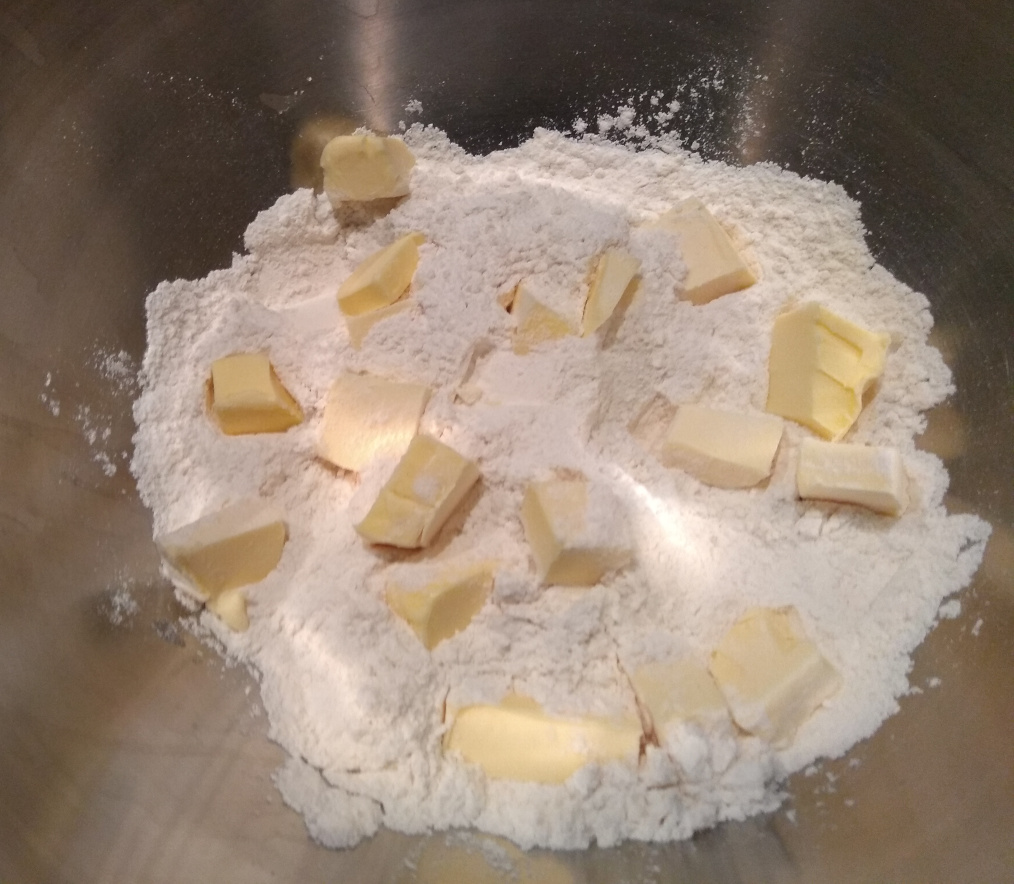 Put the plain flour into a bowl. Cut the butter into small cubes and add to the bowl. Make sure that the cubes are spread across the flour, not all in one spot.