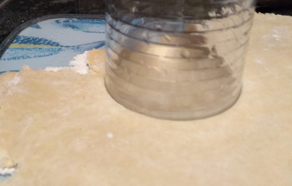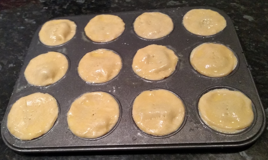 Turn out onto a pre-floured surface. Use a rolling pin to roll the mixture out to be about 5mm thick. Use a small glass (or cutter) to create 12 bases and push them into the tart tin.