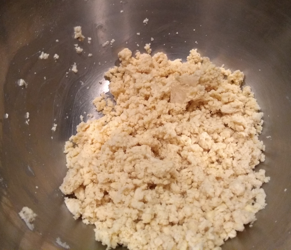 Using the tips of the fingers rub the flour and butter together to form a breadcrumb like mixture being careful not to overwork the mixture, we need things to stay cool.