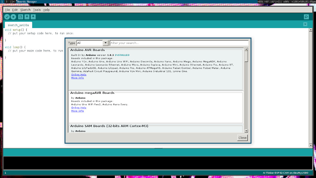 Having installed the Arduino IDE using the instructions on the offical Arduino site (mostly) I came across and issues with the UI when running under DWM a tiling window manager. The interface was squeezed down with menus opening in the middle of the screen and new windows such as the board manager opening an empty grey box as shown in the image below.